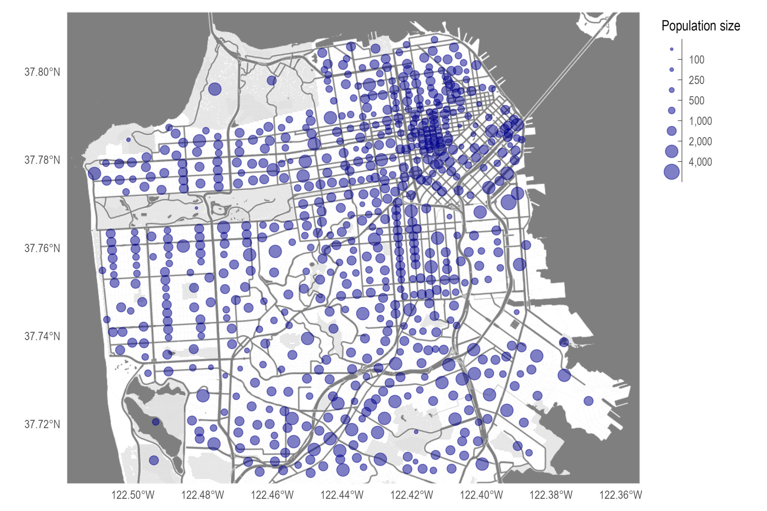 Here, I show the centroids of the blockgroups where the size is the population within that blockgroup. For most blockgroups, assuming the centroid looks fine — especially in dense areas (downtown) or highly residential areas (the Sunset), but there are a few where this is clearly wrong. For example, the centroid in the lower left is located in a lake.