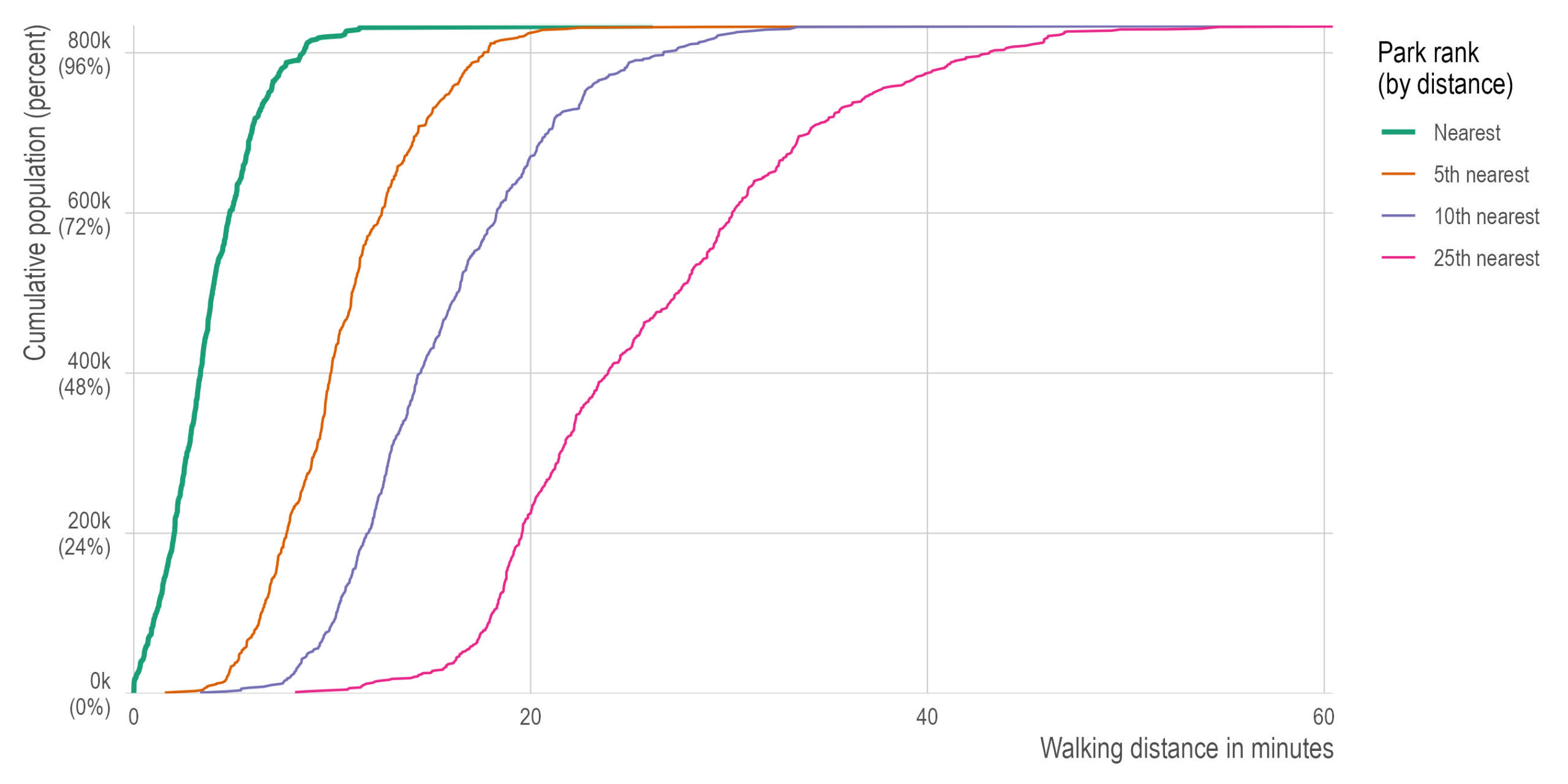 Below, I plot the cumulative population (y-axis) that is within some walking distance to a park (x-axis) for the nearest, 5th nearest, 10th nearest, or 25th nearest park (lines). For example, the thicker green line shows that about 98% of SF residents are within 10 minutes walking to a park. My number is a little different than the official numbers but it’s pretty close and the official city numbers are likely more accurate (since they know the exact address of all residential units).