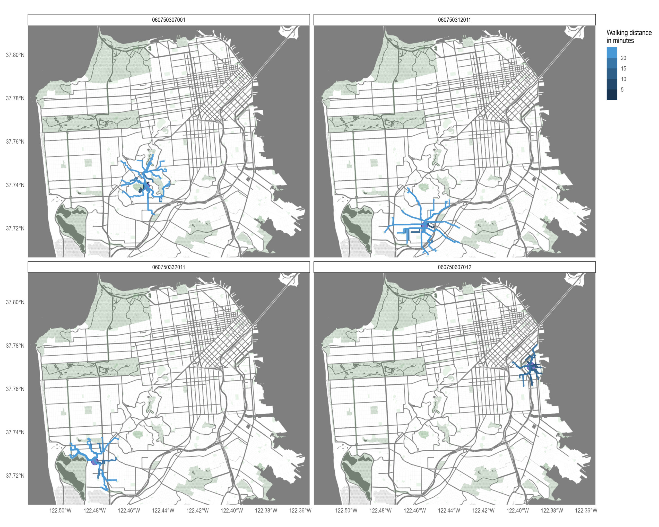 Here, I show the top four most populous blockgroups (facets) and the routes (lines) to the 20 nearest parks, colored by the walking distance. Mission Bay (lower right facet) has a plethora of nearby parks to choose from — nearly all of the 20 nearest parks are within 15 minutes of walking time. In contrast, the other three areas have a handful of nearby parks but quickly drop off to longer walks.