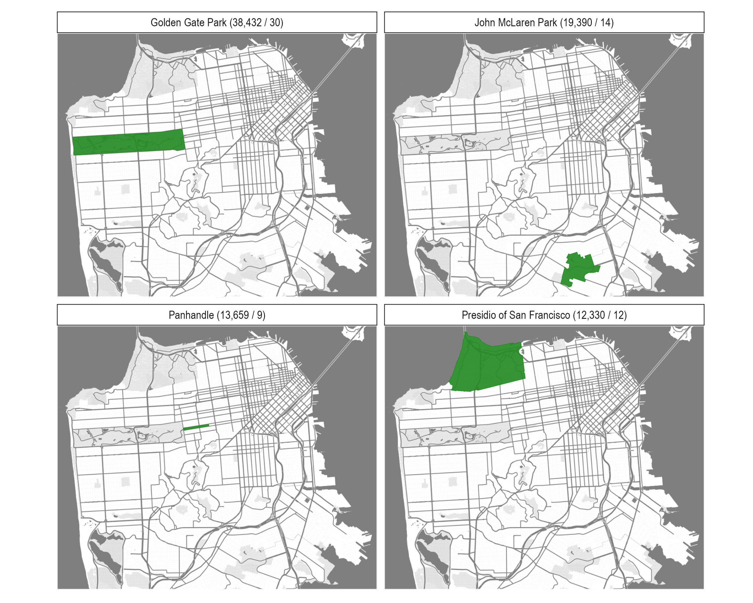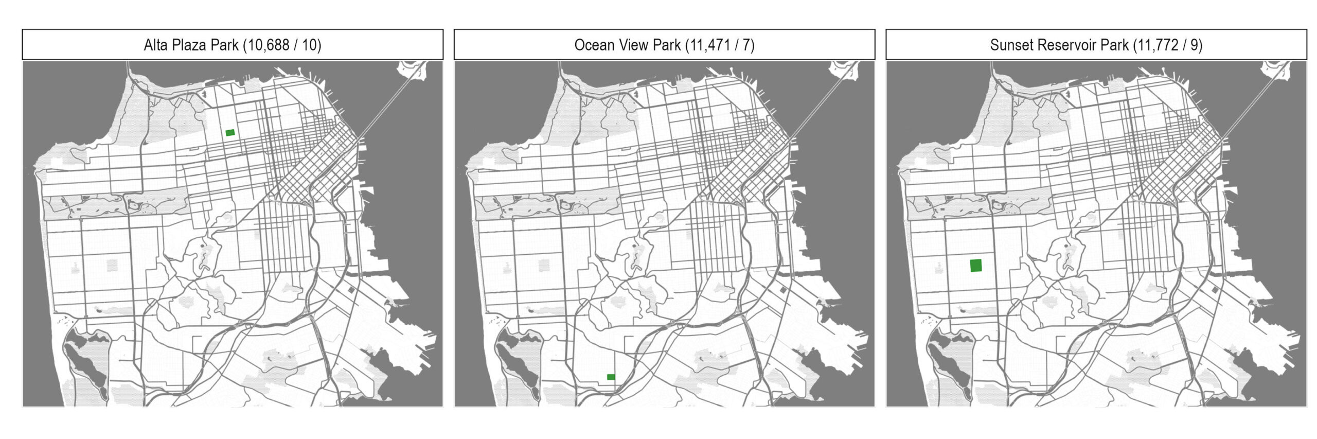 From the reverse perspective, we can ask which parks service the most people and/or blockgroups. Looking at the nine parks that serve at least 10,000 residents, four make a lot of sense. These parks have a lot of perimeter and touch a lot of different blockgroups. For example, Golden Gate Park (upper left) is the closest park for 30 different blockgroups that includes over 38,000 people. Similarly, McLaren Park is the nearest park for 14 blockgroups and includes over 19,000 people. The Panhandle (bottom left) is much smaller (in terms of total area) but has a reasonably large perimeter and is located in a moderately dense part of the city. Only half of the Presidio’s perimeter touches land but it’s so large that it still the closest park to 12 blockgroups and 12,000 people.