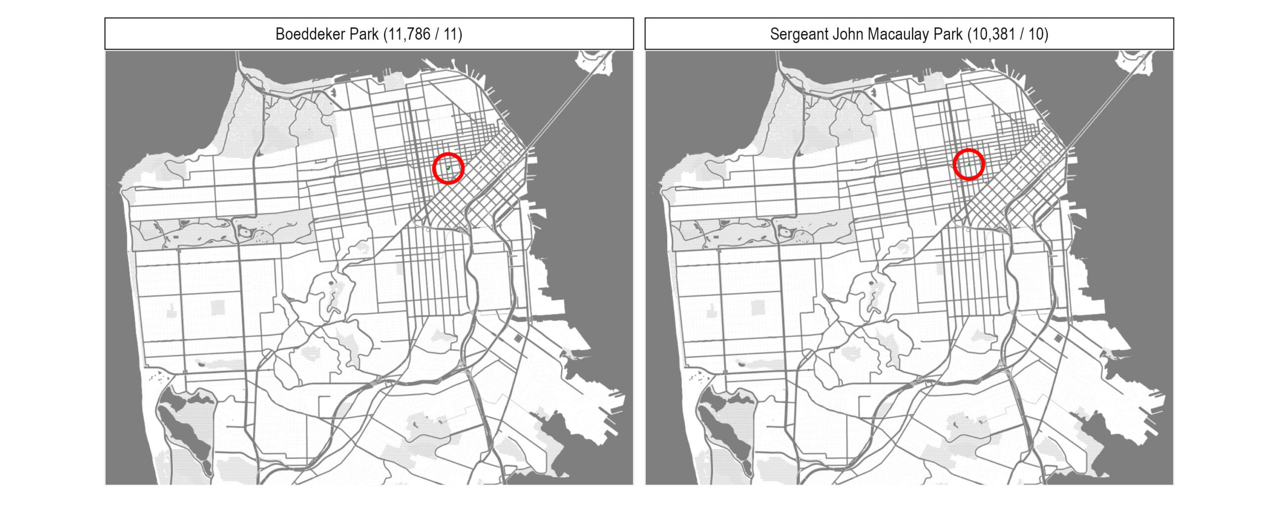 Lastly, take a look at these two tiny parks (they’re so small I had to add a red circle so I could see them). In terms of both total area and perimeter they are very small compared to all the other parks, but they still serve over 10,000 residents each and at least 10 different blockgroups. They’re located in the densest part of San Francisco.